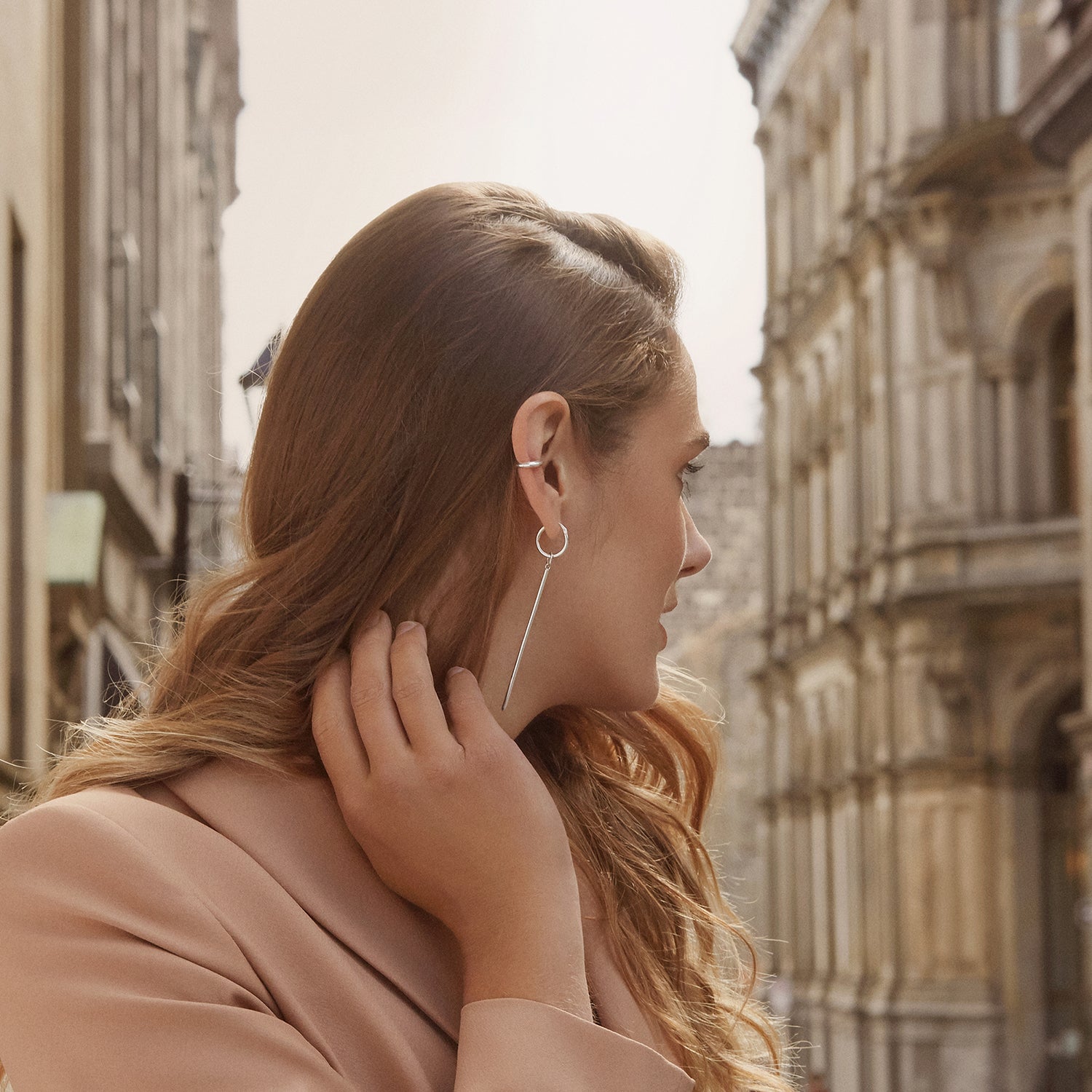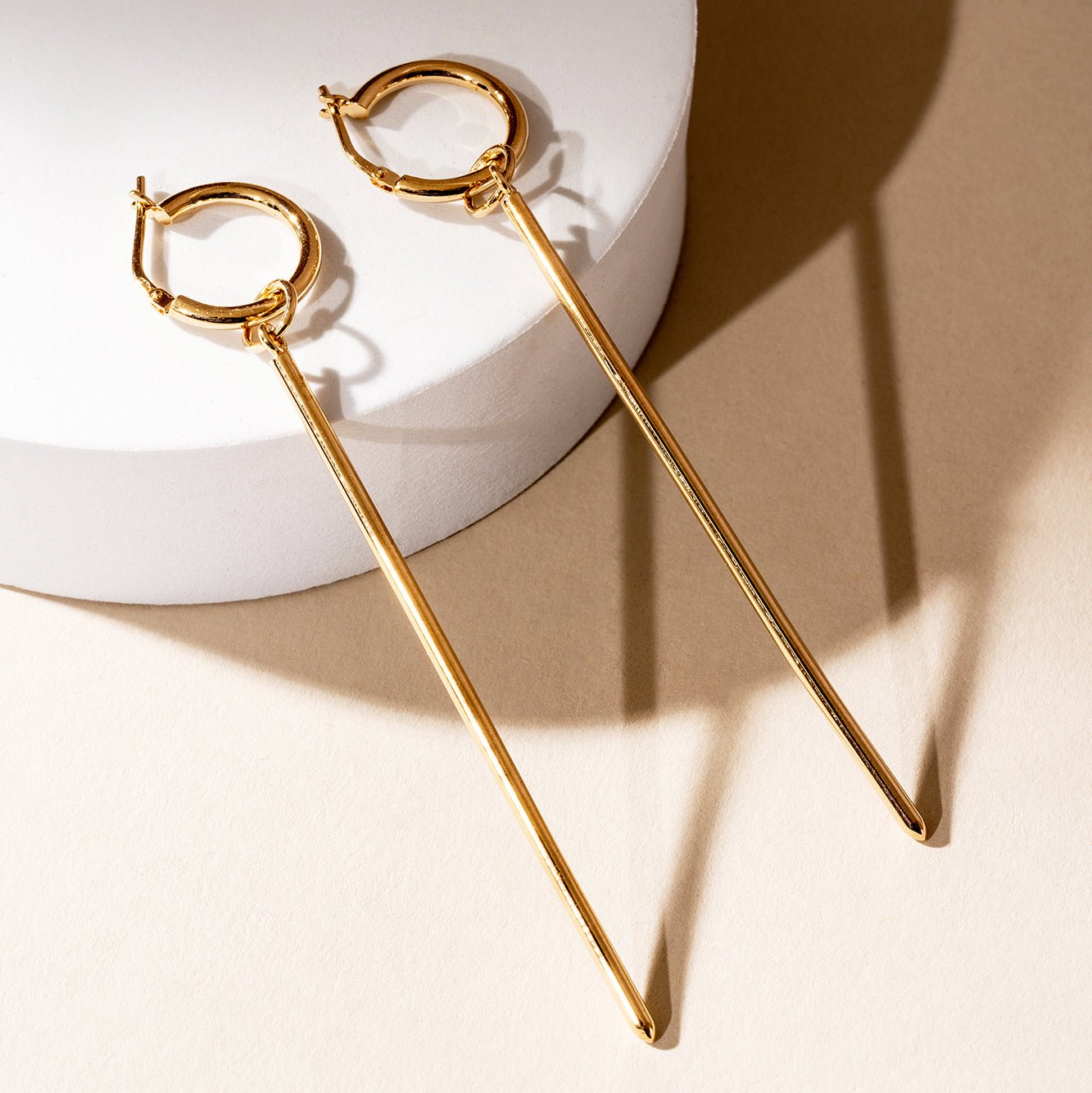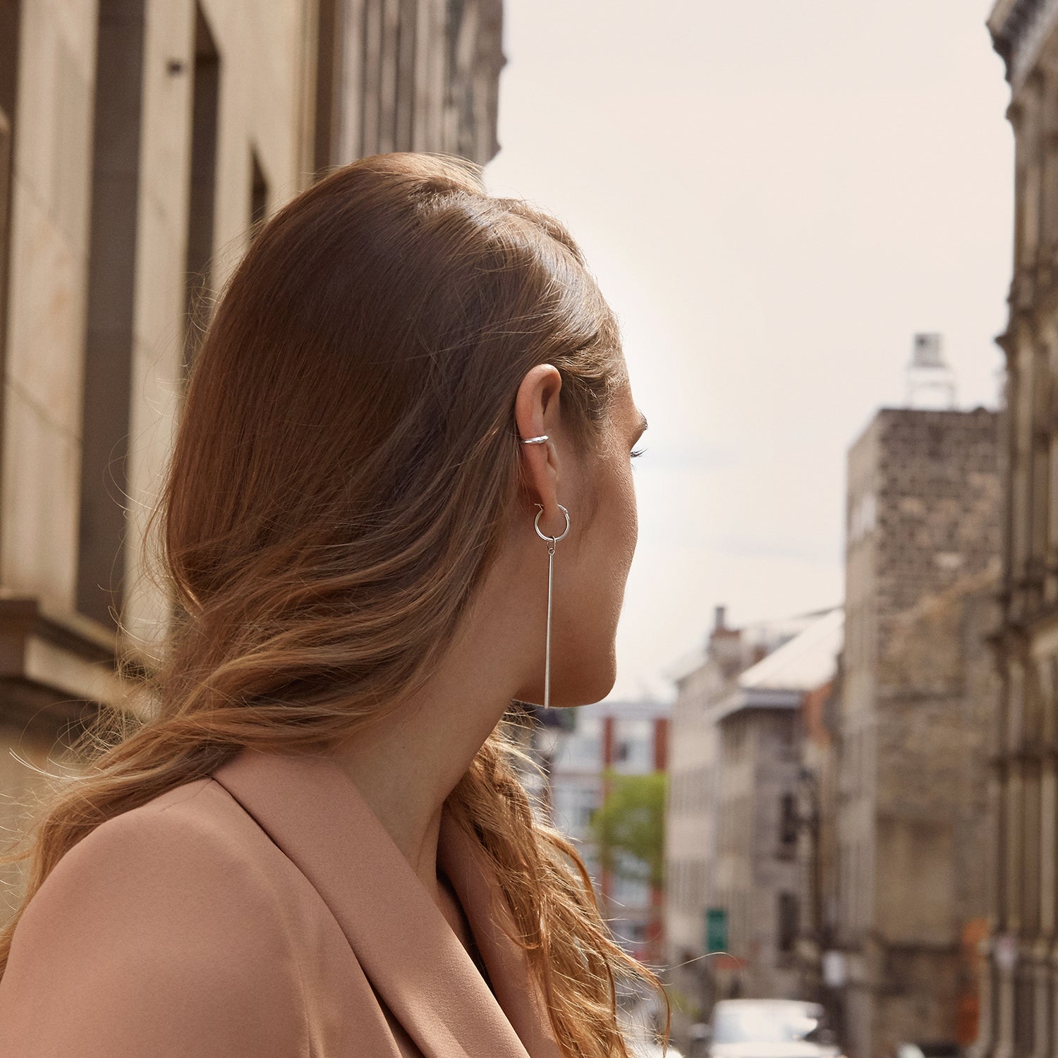 These long sterling silver hoop earrings are chic yet minimalist. The simplicity of their design makes them easy to wear with patterned and plain clothing.
