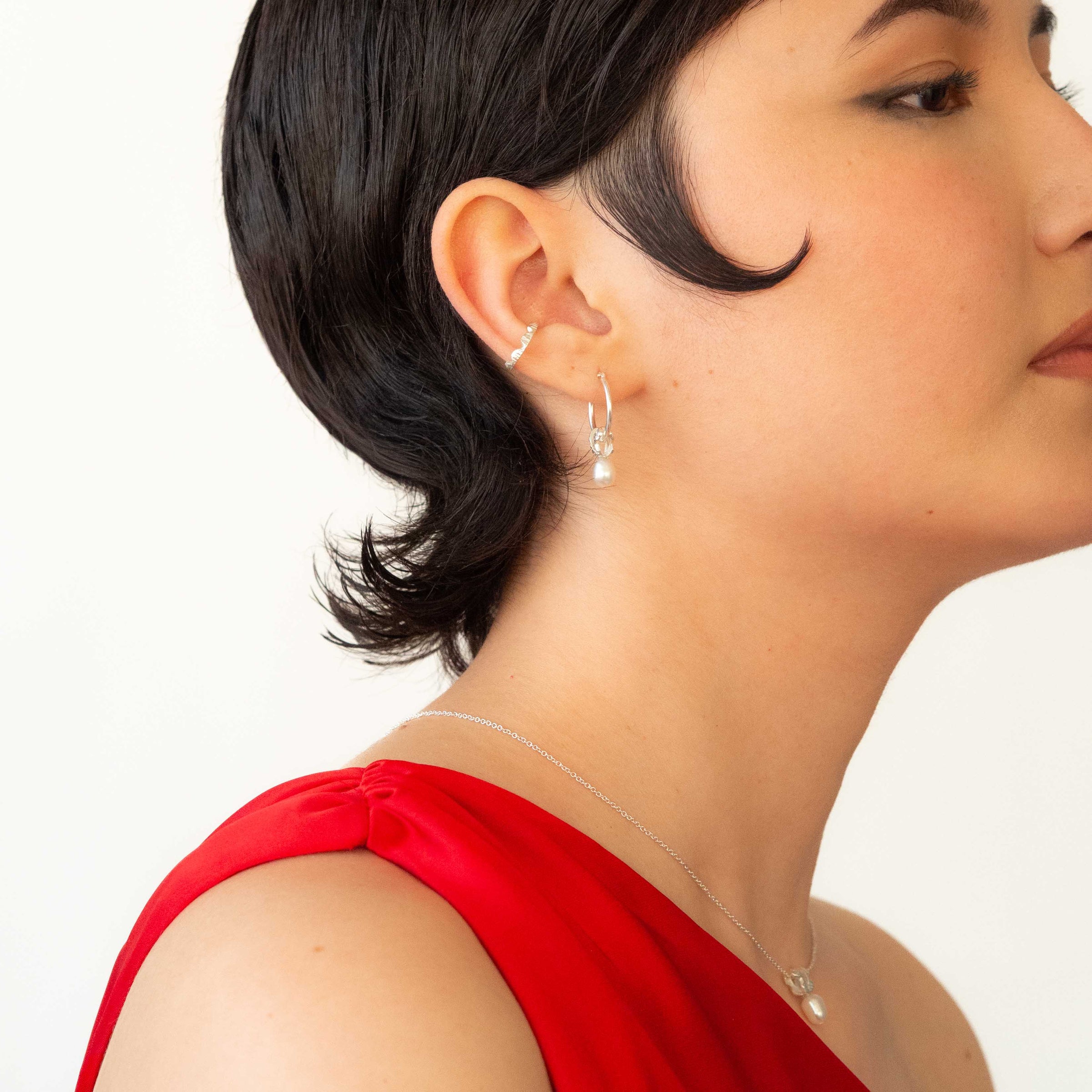 Each necklace is handcrafted in small batches in Montreal, Canada, ensuring lasting quality and unique artistry. Pair it with the Essence ear cuff or Éternelle ring, which features the same intricate lace-like motif, or with the Croisée hoop earrings, adorned with matching pearl charms, to complete the look from the Lié collection.